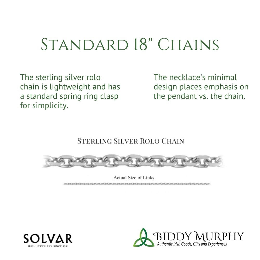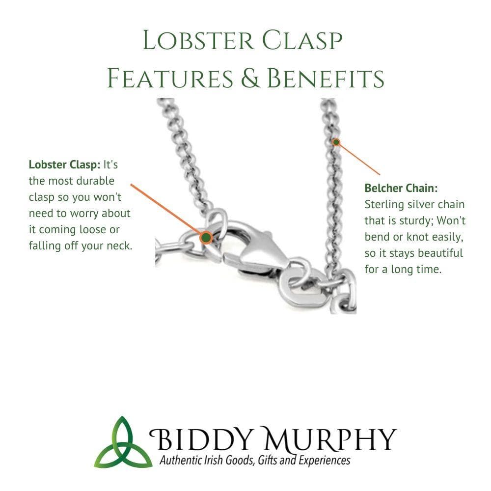 An authentic Irish gift, this Celtic Cross necklace is crafted by trained Irish artisans in Co. Dublin and hallmark stamped at the Assay Office in Dublin Castle. Crafted from genuine 925 sterling silver, this necklace is hypoallergenic and nickel-free for a long-lasting shine. The intricate Celtic weaves and knots on the single sided surface of the cross are inspired by traditional Celtic Crosses. Since this pendant is large, measuring approximately 1 ⅝” tall x ¾” wide, the beautiful design is visible to viewers and is sure to garner many compliments! The Celtic Cross pendant hangs on a belcher chain, which is sturdier than a standard rolo chain and designed to endure any active lifestyle. Belcher chain features a lobster claw clasp, a secure clasp that lays flat on the neck for comfortable everyday wear. This cross also comes in a Biddy Murphy heritage box that shows the Round Tower of Glendalough. Gift box is the perfect place to store and protect your jewelry for future use.