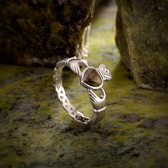 - TIMELESS STYLE & DESIGN: This Irish Claddagh ring has been uniquely paired Connemara marble - known as "Ireland's gemstone" as the heart. It's 3/8" tall with a 1/2" wide band. Delicate and comfortable