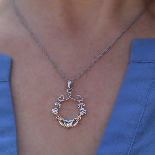 Customer Sharon rated this necklace 5 stars and said "This is a beautiful and delicate necklace that perfectly incorporates several classic Irish symbols. It's a lovely way to express one's Irish heritage. The chain is good quality and a nice length, too. Overall, it's even better that I had expected and I'm very pleased with it." We couldn't have said it any better than her review! This is truly one of those unique Irish gifts for women. It's contemporary design combines a sterling silver heart necklace with shamrocks and a Claddagh for a one-of-a-kind stylish Irish pendant necklace. The pendant itself measures 7/8" in diameter and comes with a sturdy 18" chain which features a strong clasp, so you need not worry about losing this shamrock necklace. From the other reviewer feedback, this Claddagh necklace is an ideal Irish gift for women. Whether it's for your wife, sister or friend, she'll definitely receive compliments on this Irish pendant necklace. This necklace is made of sterling silver and has been hallmark stamped at Dublin Castle, ensuring the authenticity of the metal used in the design. It is beautifully handcrafted by our maker-partner. We are proud to partner with authentic Irish artisans that support the heritage and culture of Ireland through their unique Irish goods and gifts.