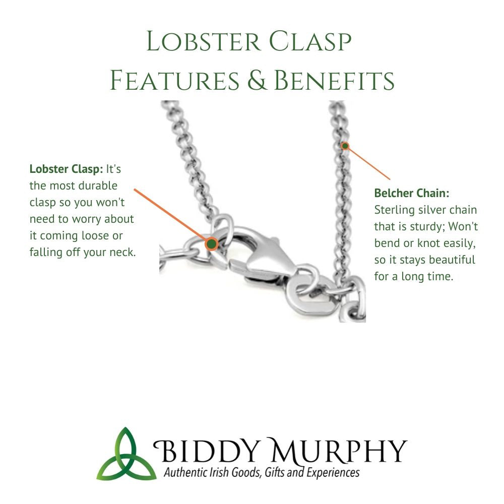 The Claddagh measures approximately 7/8" tall by 1/2" wide and is crafted from sterling silver. The pendant is offered on a custom sterling silver belcher chain of three different lengths 18", 20", or 24". These custom chains are sturdy and strong as they have thicker and wider links. The chains fasten with a lobster claw clasp that will lay flat on your neck and is easy to open!