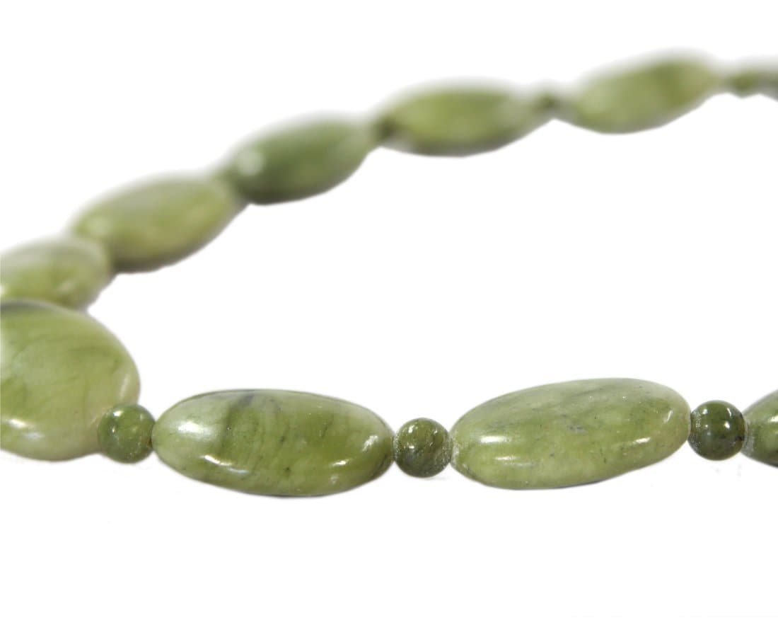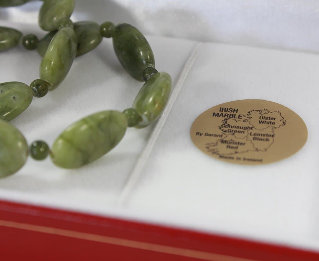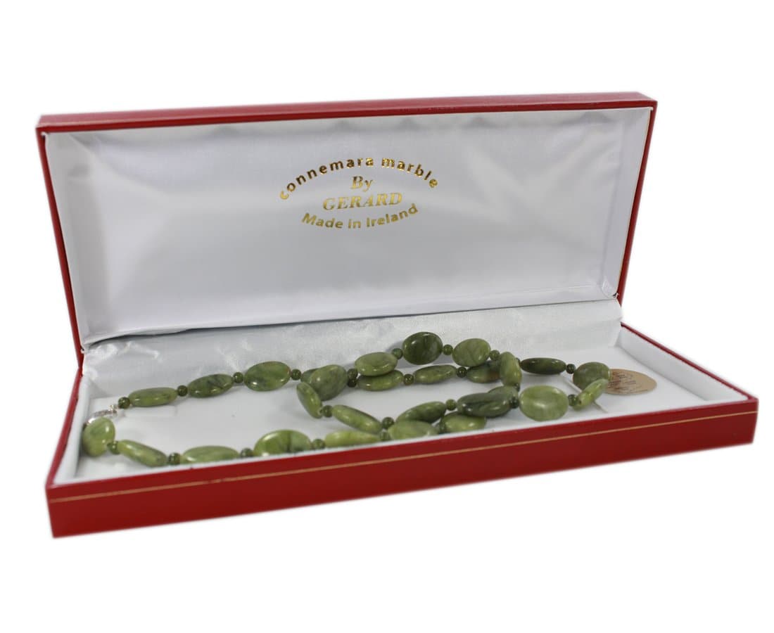 For a true piece of Ireland, get this gorgeous oval bead necklace. Made from Connemara marble, a rare green stone that is found only in Ireland, the beads on this necklace will vary in shade, but never in beauty! This oval bead necklace measures approximately 25" long, and features beads all the way around. A wonderful addition to any outfit, this unique piece of jewelry is sure to earn you many compliments! This fine piece of Irish jewelry comes in a gift box, easy to gift for any occasion! The beautiful necklace is beautifully crafted by our maker-partner in Co Mayo, Ireland. Their products are renowned worldwide for the finest color and finish. Get this fabulous oval beaded Connemara necklace for yourself or a loved one today!