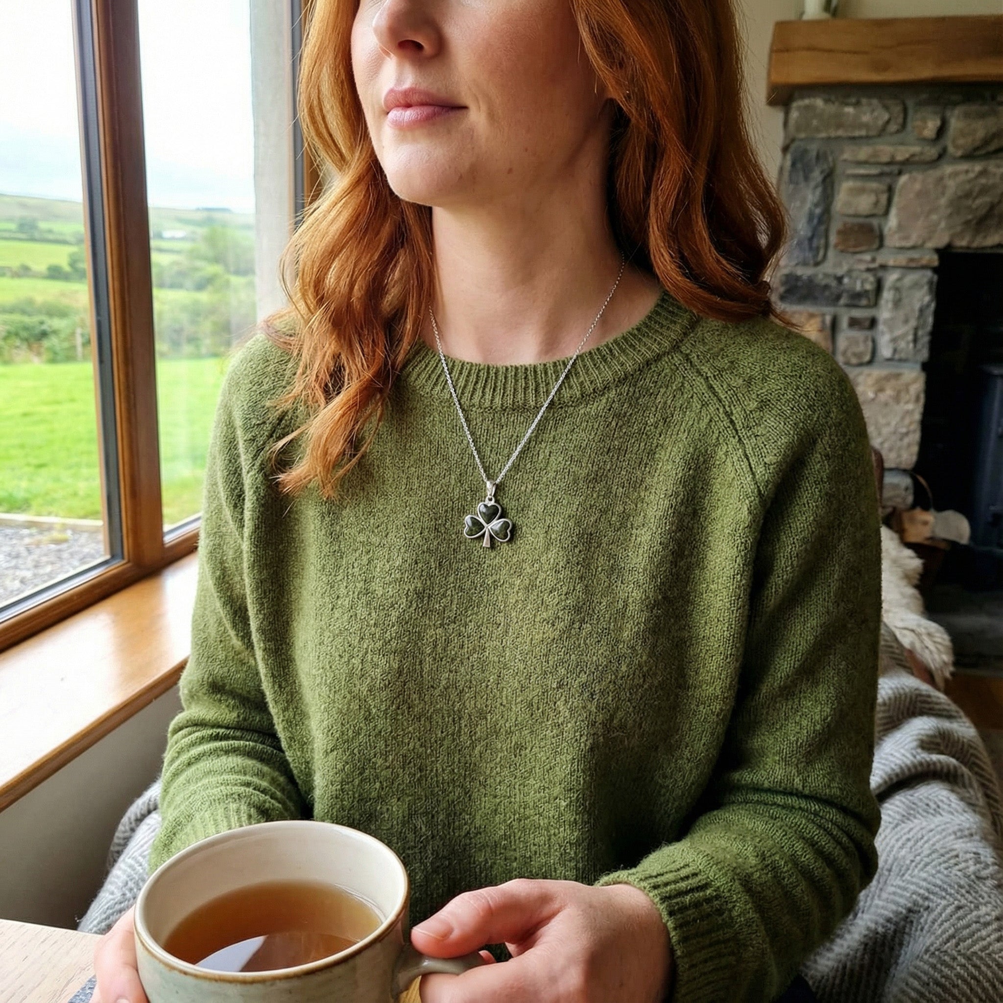The traditional three leaf clover design symbolizes faith, hope, and love. Measuring 5/8 inch tall by 5/8 inch wide, the pendant hangs from an 18 inch sterling silver chain for an elegant look that works for both daily wear and special occasions. Handmade by skilled artisan jewelers in Ireland, this necklace reflects timeless craftsmanship and meaningful Irish tradition.