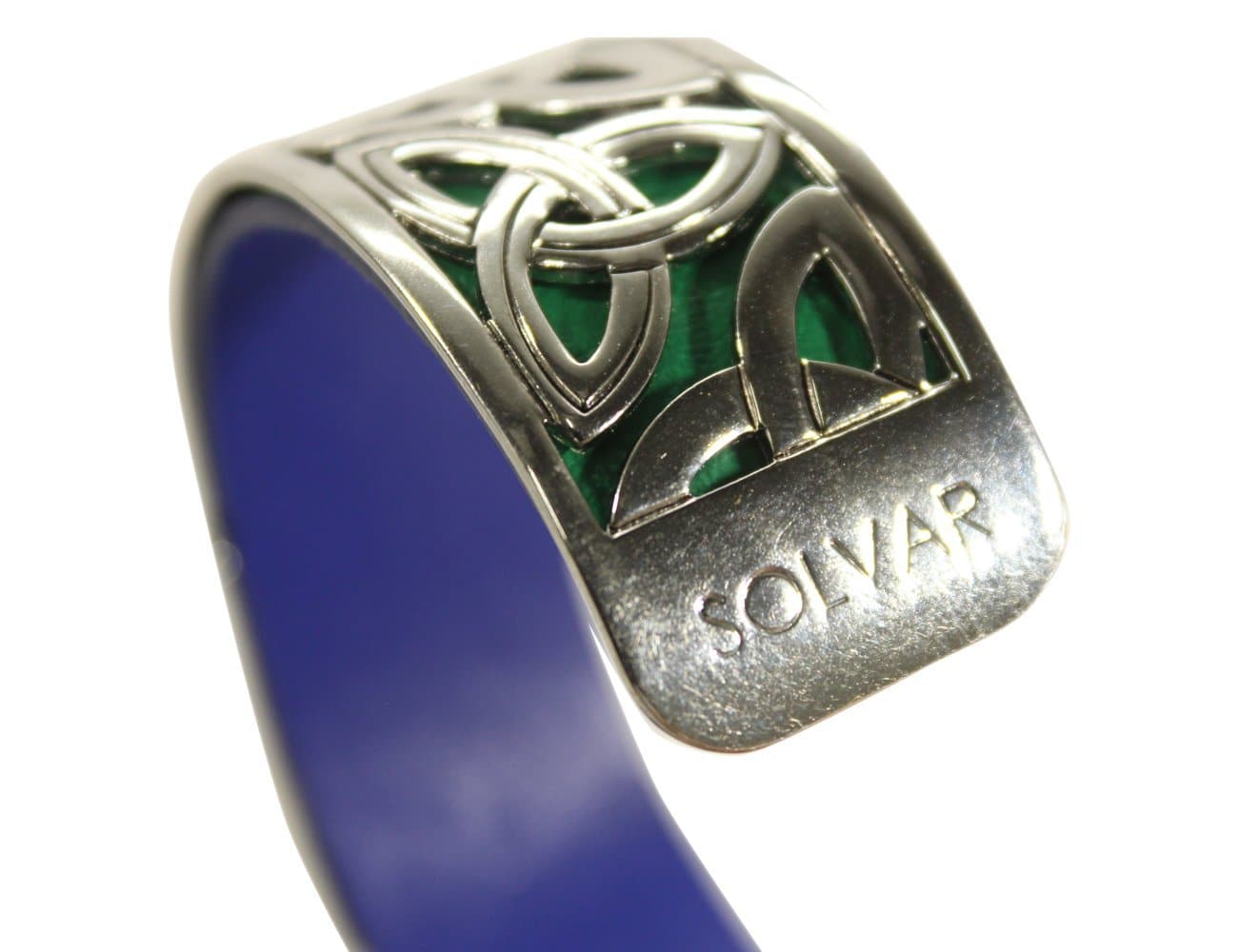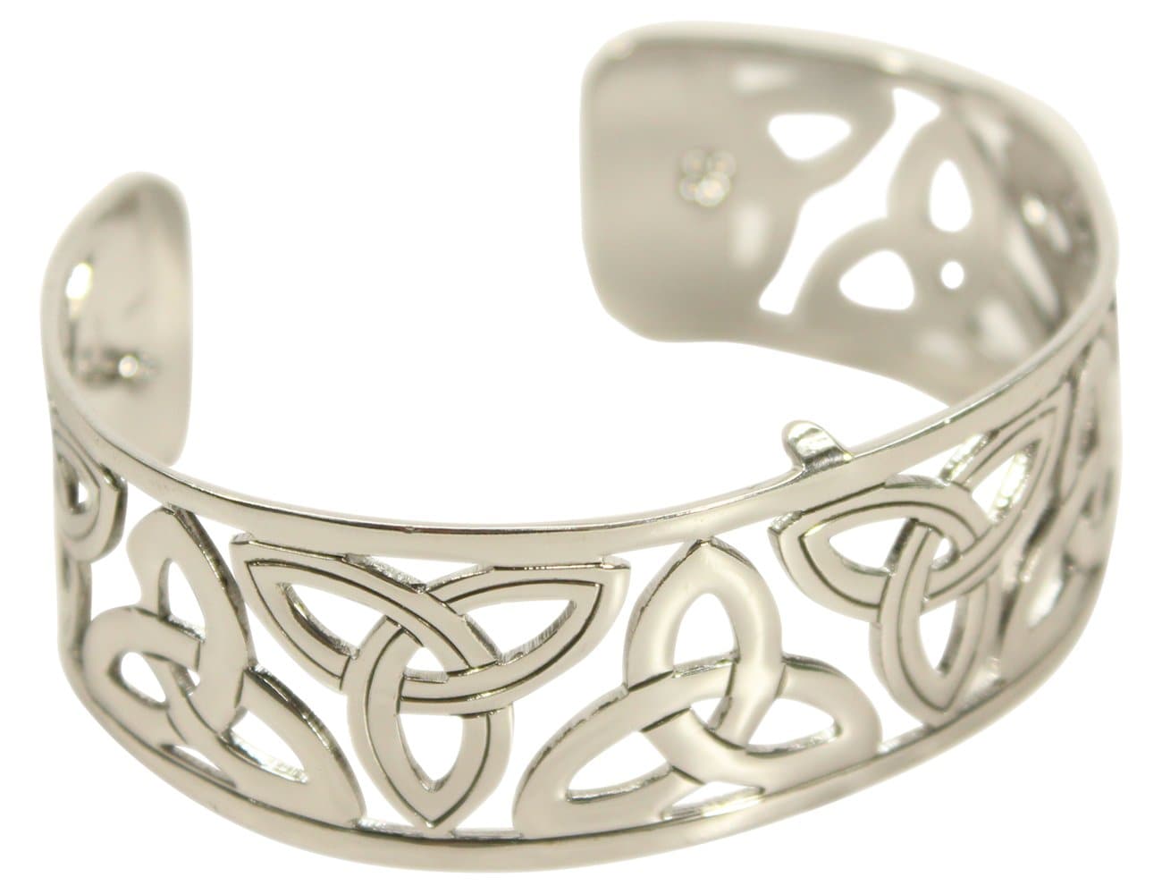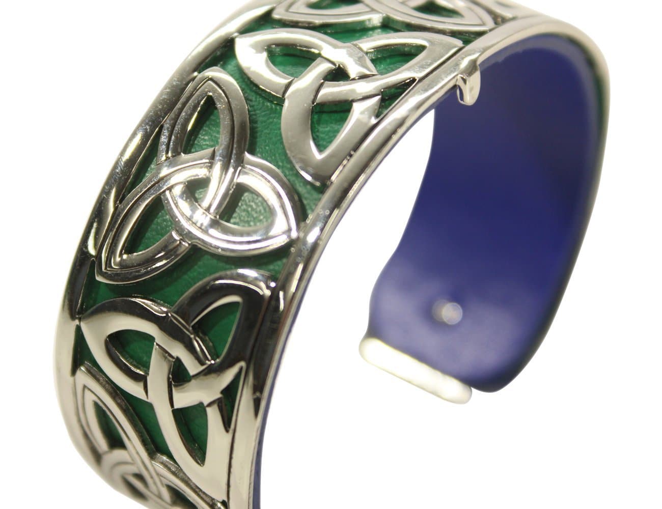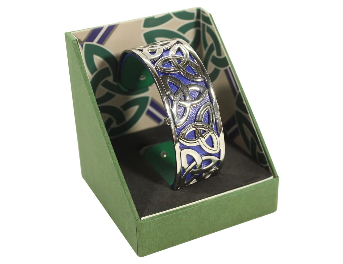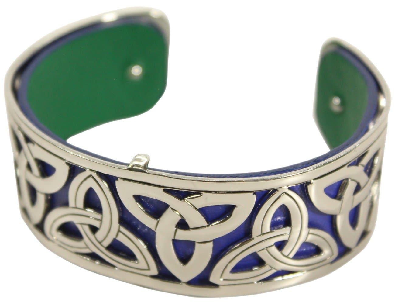 A colorful Irish accessory, this Trinity Knot bracelet is a fun and fashionable finishing touch to your wardrobe! The bracelet features an open Trinity Knot design to show the colored leather strap. The double-sided strap is green on one side and blue on the reverse side for two bright colors! The Irish bracelet measures approximately 2" wide and 7" long and is crafted from rhodium plating to avoid tarnish. The strap is crafted from leather. The Trinity bangle is crafted by our maker-partner located in Co. Dublin, Ireland. Our maker-partner is a family owned company that has been making high quality Celtic jewelry for over seven decades. Get three looks in one accessory with this trendy Trinity Knot bracelet!