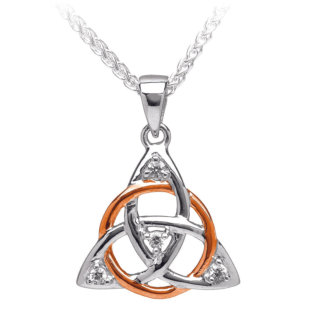 - A sterling silver and rose gold Irish Knot necklace with cubic zirconia stones.