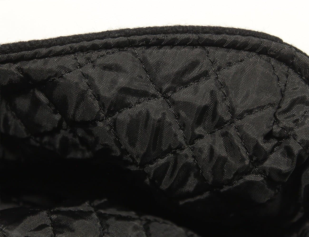 Nice all-wool herringbone fabric with an insulating quilted lining. The built-in flaps fold down to cover my ears and ward off the frigid Minnesota air. The whole package is stylish and warm.