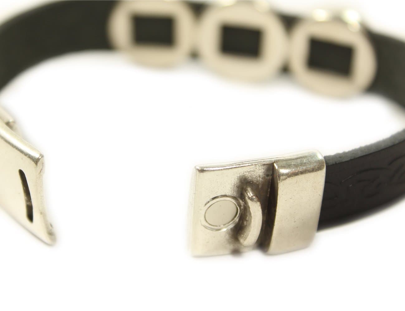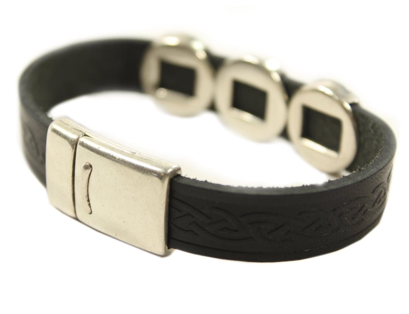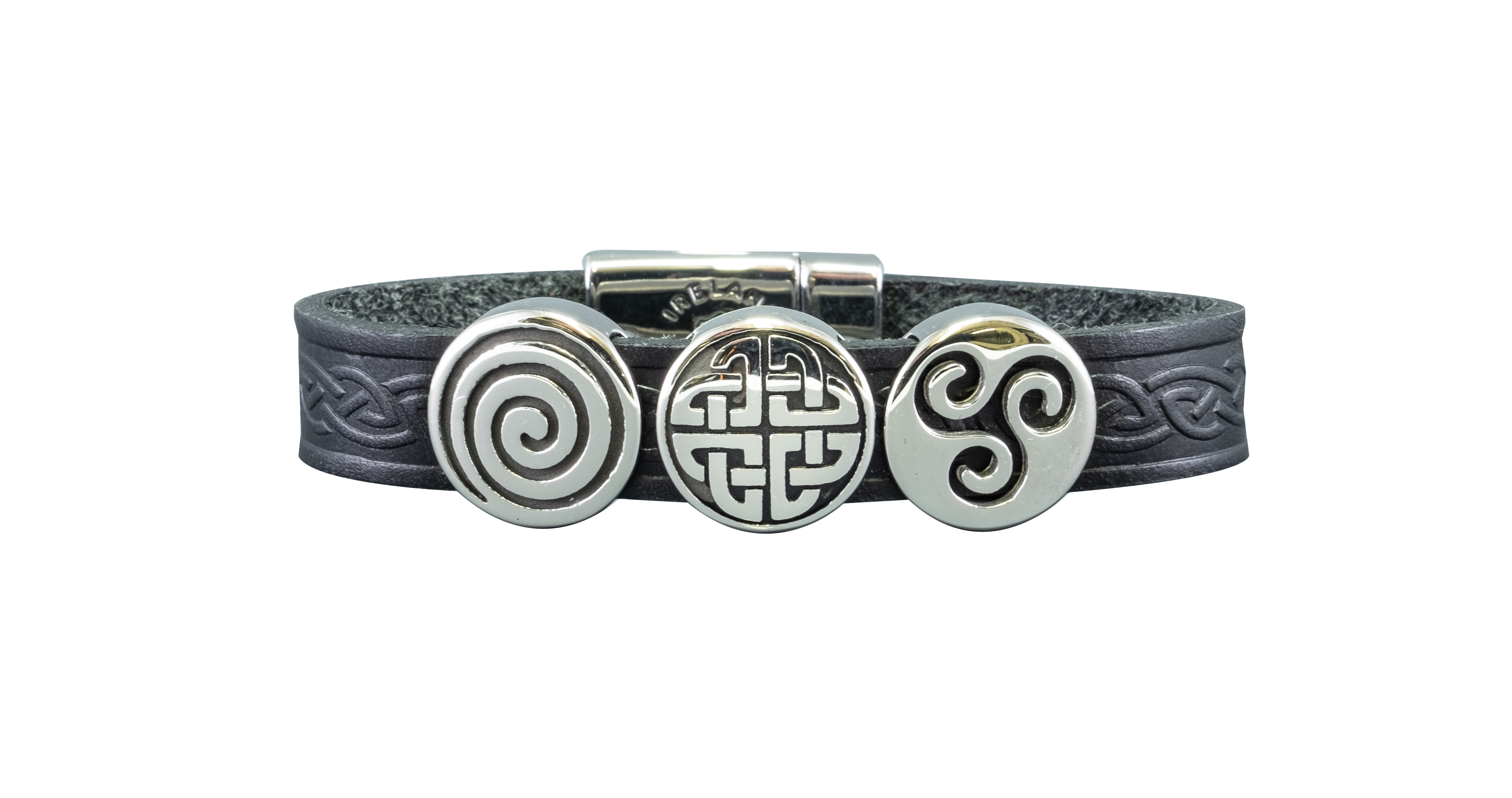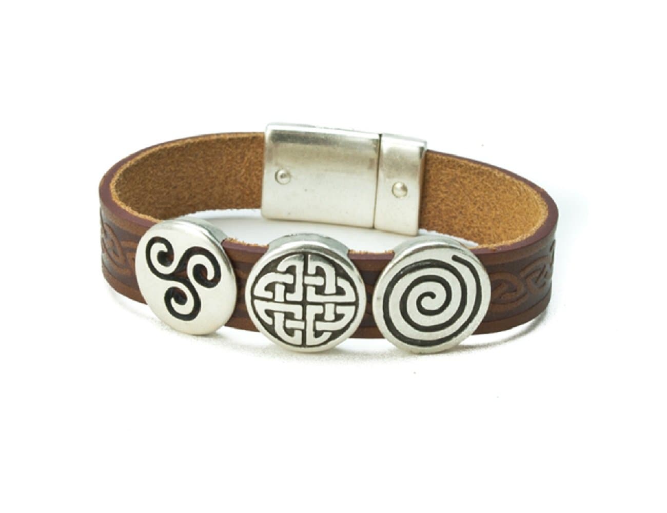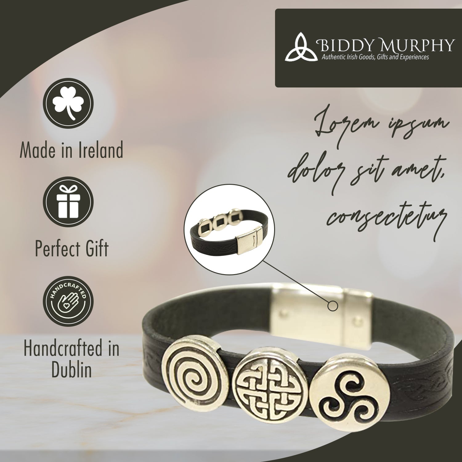 Add a chic, high quality, and best of all Irish-themed bracelet to your jewelry collection! You won't want to take this Celtic leather charm bracelet off once you snap it on your wrist. This gorgeous Irish bracelet features a genuine leather band embossed with a Celtic weave. Adorned with three charms, the eternal knot, the Triskele and the Celtic spiral, the bracelet makes it easy to show off your Irish side! Attaching with a magnetic closure, you will never need to ask for help when taking this bracelet on or off, as all it takes is one hand! The magnetic closure will keep the bracelet snapped safely and securely!