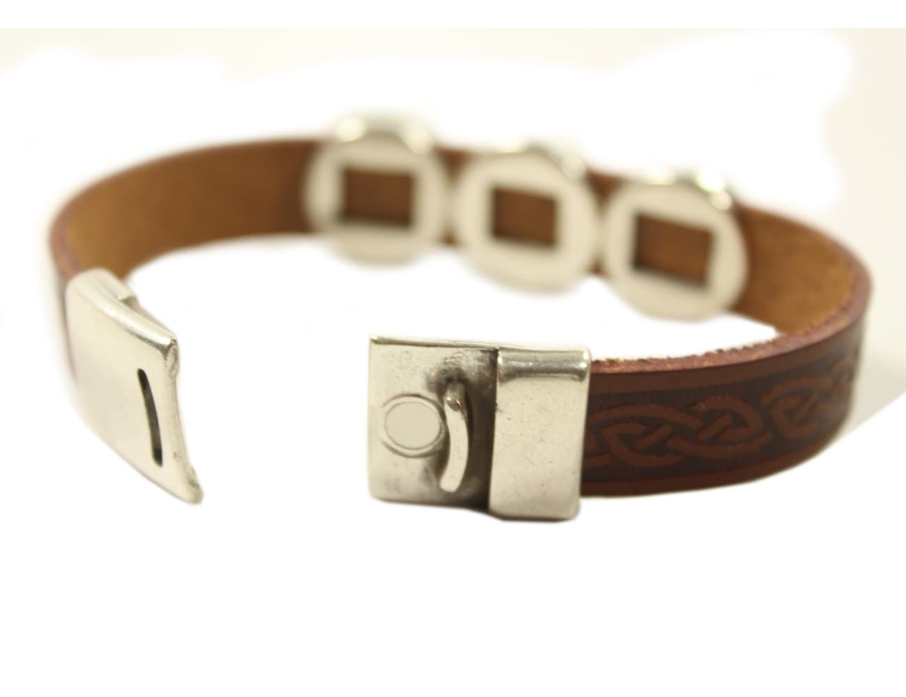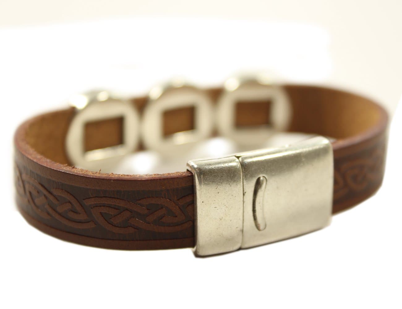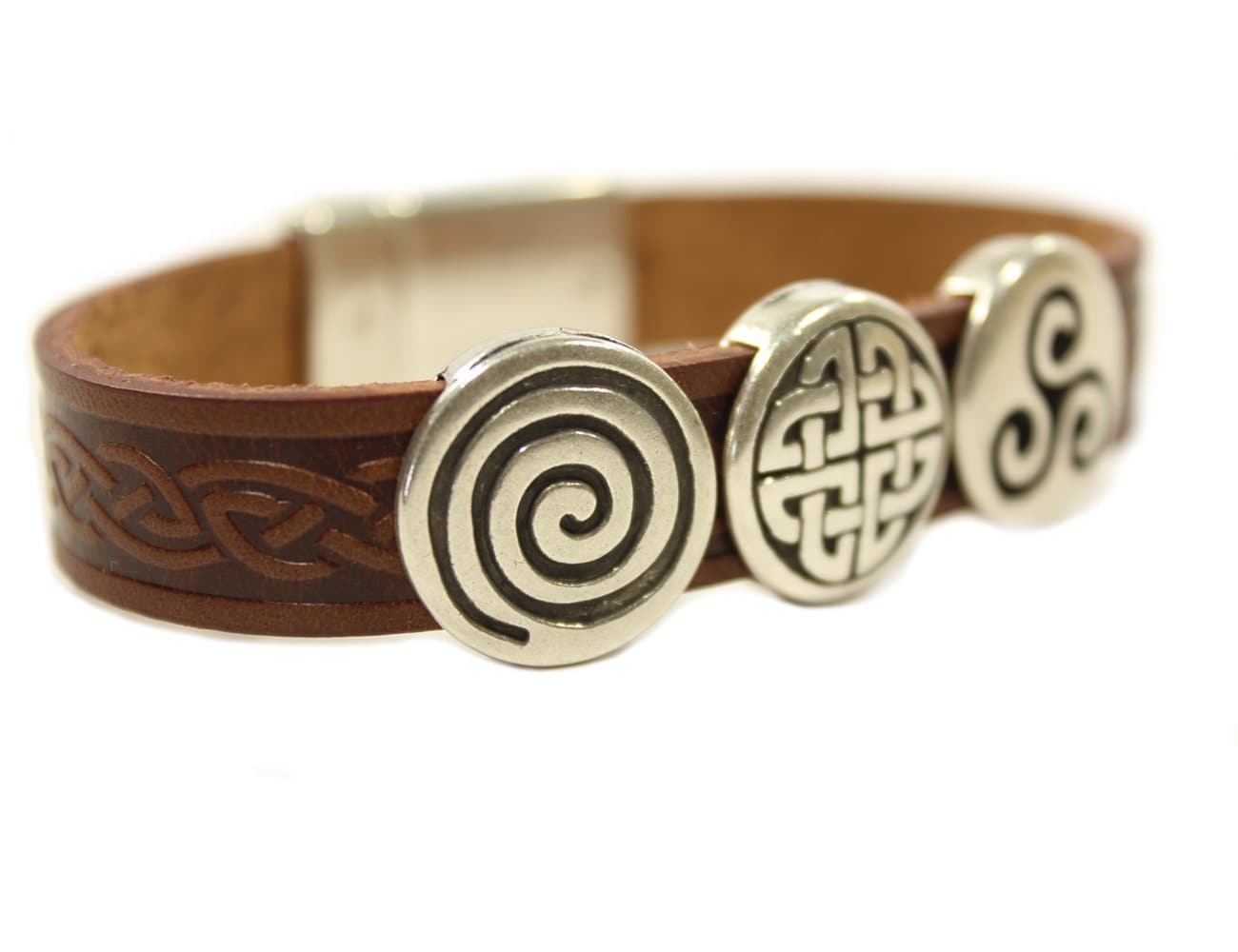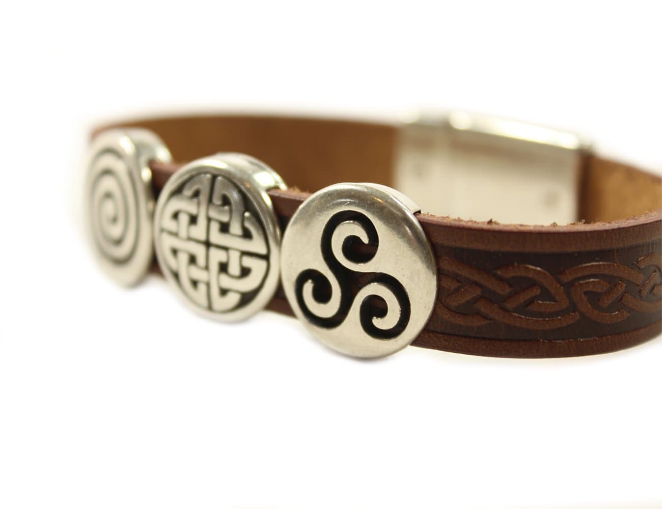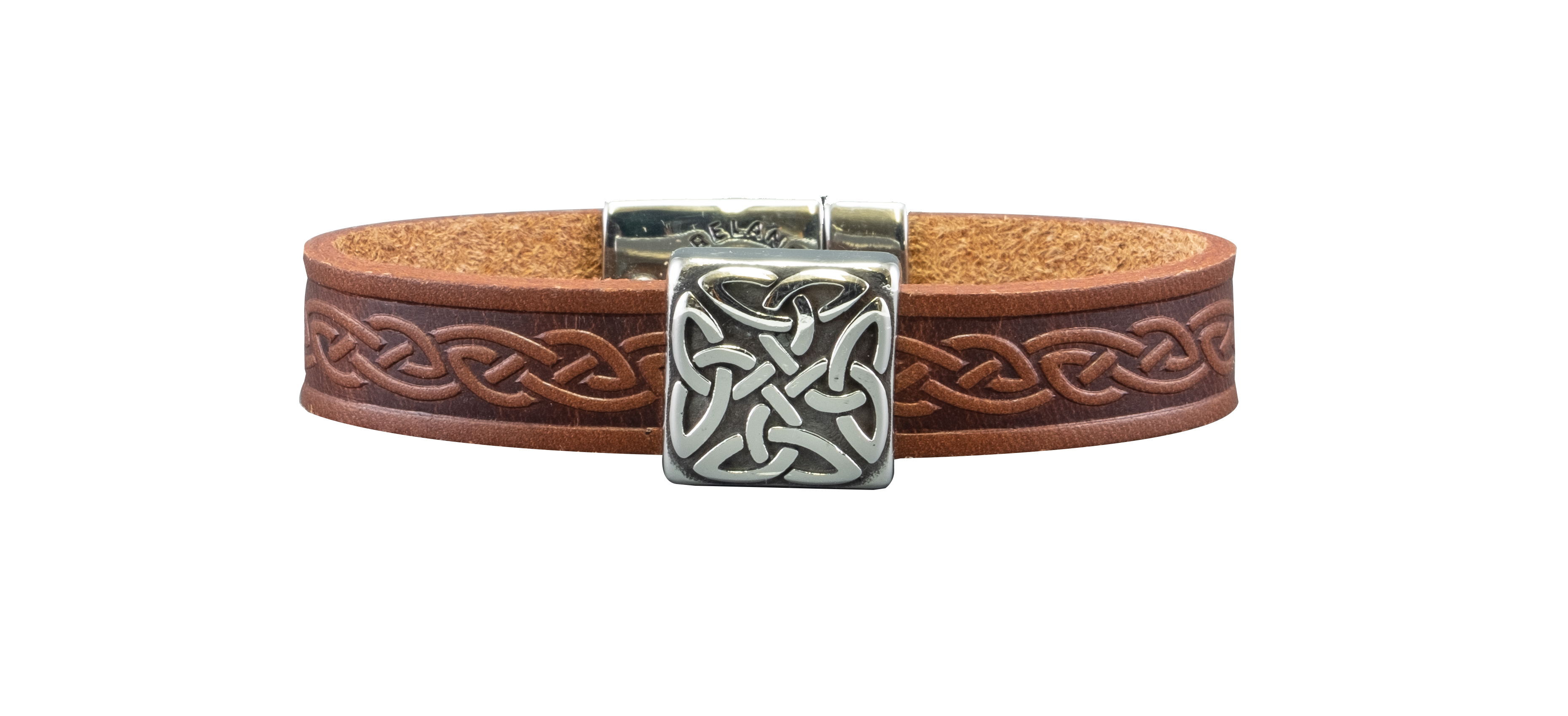 It speaks so much of Ireland with the Celtic knots and spirals. Truly unique. Bought the size 7 which at first seemed a little large. It took only a few wearings for the leather to soften and mold to my wrist and upper hand.